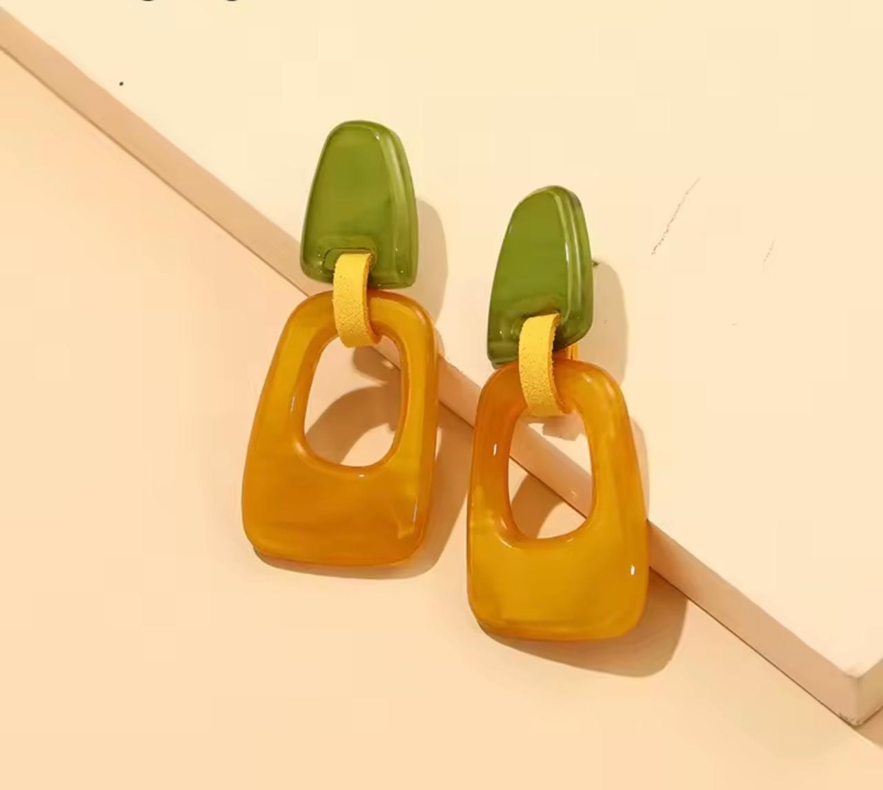 Aretes amarillos en resina. 7.4 cms de largo, 3 cms de ancho