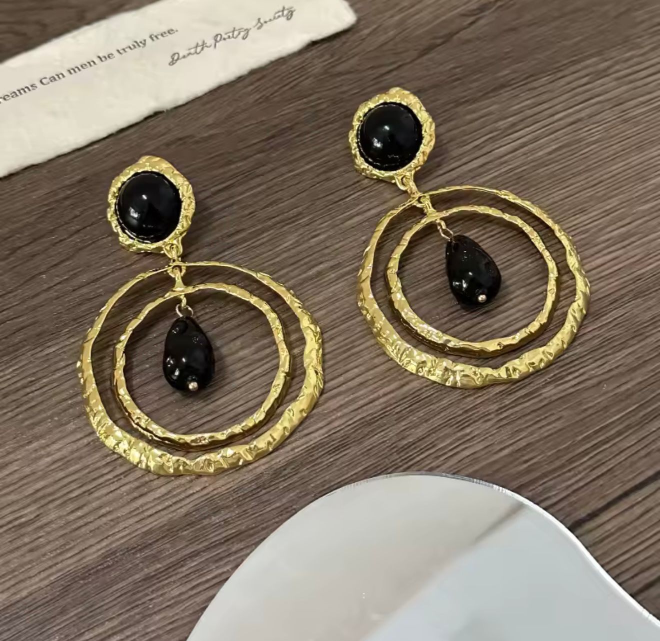 Maxi Aretes aros dorados con piedra negra elegante. 8.5cms de largo, 6 cms de ancho