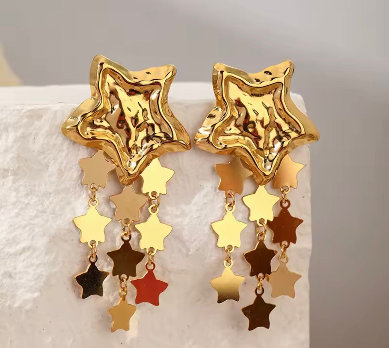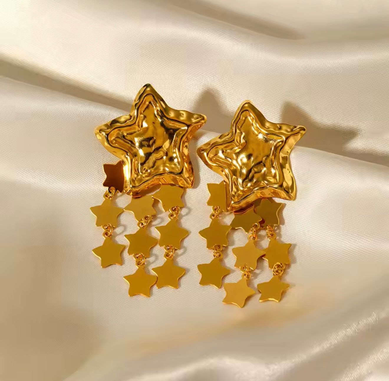 Maxi Aretes dorados de estrellas con diseño colgante. 6.5 cms de largo y 3 cms de ancho