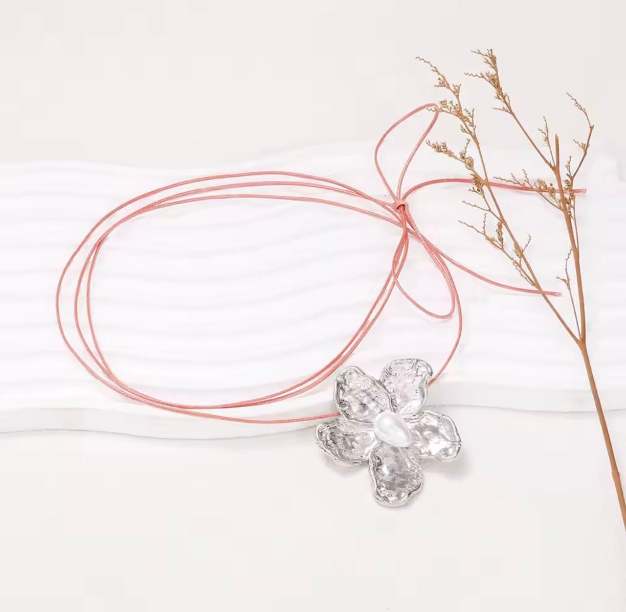 Collar cuerito y flor plateada